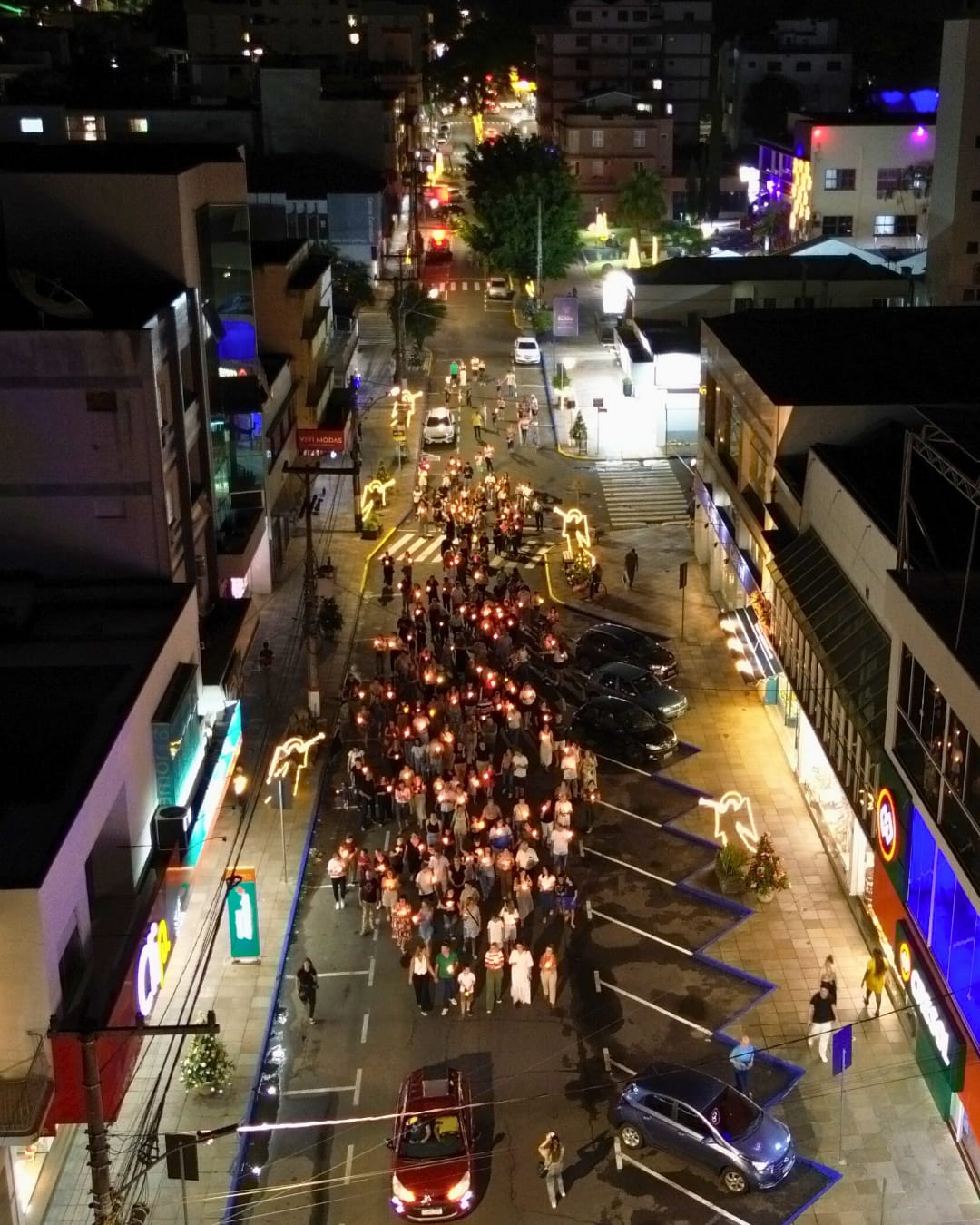 A movimentação começou em frente à Casa de Cultura com a Caminhada Luminosa. Um lampião histórico, conduzido pelas integrantes do Coral Vida e Canto, trouxe a chama que foi distribuída entre as pessoas para acender as velas.