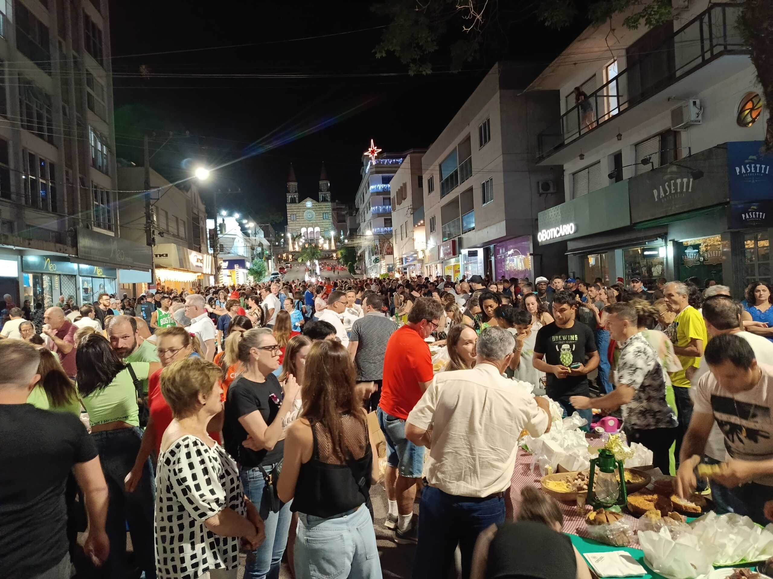 Principais novidades do Natal Mais Encantado 2024, a 1ª Ceia Comunitária de Ação de Graças e o Natal Tropeiro levaram cerca de duas mil pessoas ao centro da cidade na noite do sábado, dia 21. A confraternização mobilizou empresas, entidades e comunidades no preparo e distribuição dos alimentos e na organização das 41 mesas colocadas lado a lado, ao ar livre, na Rua Padre Anchieta.