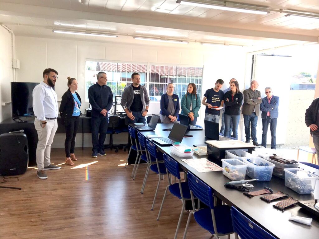 Na sequência foram oportunizadas visitas guiadas ao Contêiner Maker Space para que as pessoas pudessem conhecer o funcionamento do laboratório que será utilizado pelos alunos do turno inverso e, ao mesmo tempo, no pátio do educandário, foram expostos os cases de inovação desenvolvidos por empresas de Encantado e região.