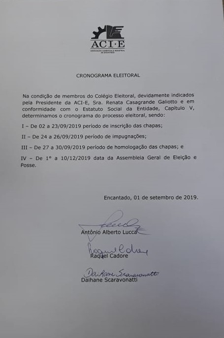 Na condição de membros do Colégio Eleitoral, devidamente indicados pela Presidente da ACI-E, Sra. Renata Casagrande Galiotto e em conformidade com o Estatuto Social da Entidade, Capítulo V, determinamos o cronograma do processo eleitoral, sendo: