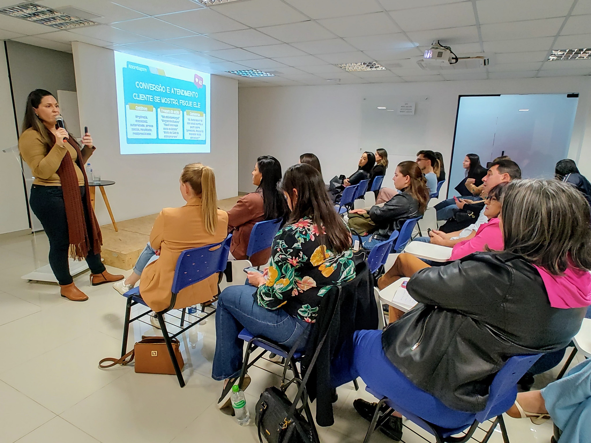 Com o tema “Comunicação, Conexão e Resultado: venda todos os dias nas redes sociais”, a palestrante conduziu a atividade de forma dinâmica, apresentando exemplos práticos e destacou que, para vender nas redes sociais, é essencial compreender o comportamento do público e produzir conteúdos que gerem conexão.