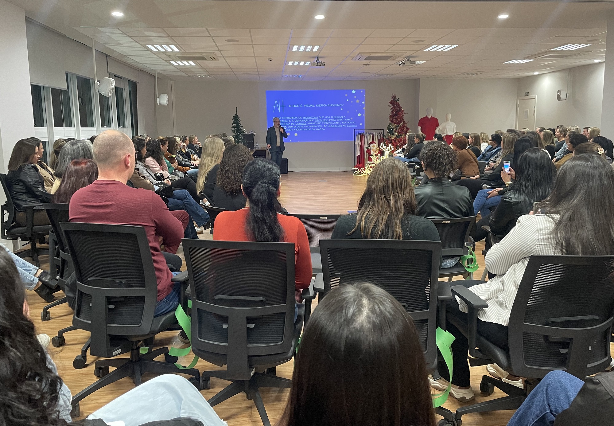 Ministrada por Antonio Haesbaert, especialista em visual merchandising e diretor criativo, a capacitação trouxe conteúdos práticos e estratégicos voltados ao varejo. Ao longo da oficina, os participantes acompanharam dicas sobre layout de loja, ambientação temática, uso de paletas de cores, estímulos sensoriais e fundamentos do vitrinismo natalino.